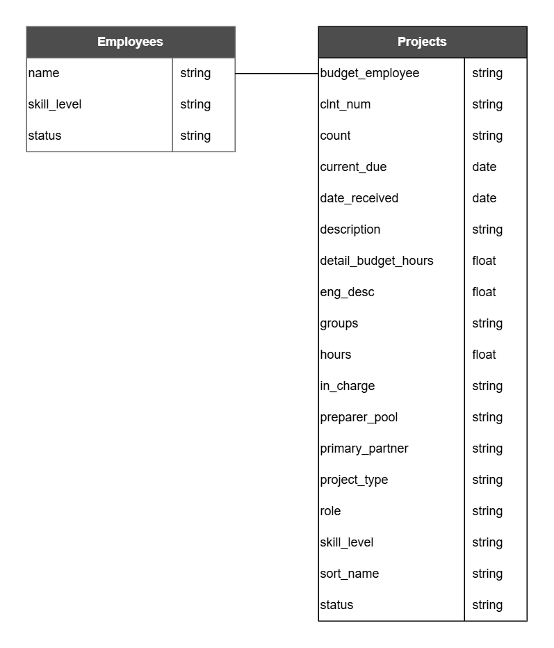 - Projects - All details about the client tax work (referred to as projects) within the firm, including the client name, client number, and whether the client is in a group. Also contains project details like the due date, the type of project, the roles within each project (a preparer and one or more reviewers), the hours assigned to each role, the project status, and when the project was "checked-in" and ready to be assigned (the date_received).